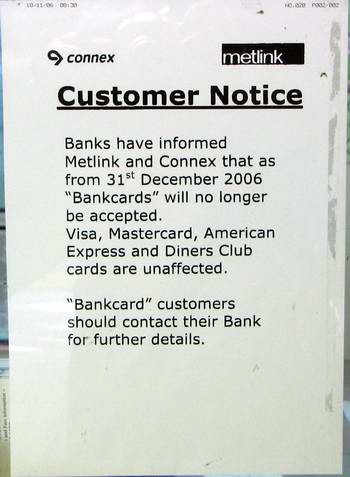 Debit Card TypesPage last modified/checked: Saturday, 23 February 2002The larger machines at rail stations have the facility to purchase tickets using debit cards (rather than credit cards). Tickets purchased by this method feature the message "RETAIN AS EFTPOS RECEIPT", followed by the last digits of the debit card number (?), the type of transaction (cheque or savings), the debit card type, the country/currency code (?), and the approval code. Initially, the machines were installed with a blank metal panel over the space where the keypad and card slot would ultimately be fitted. From our observations, the debit card facility was gradually introduced from January 1998. |