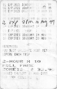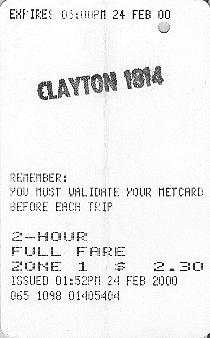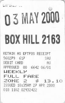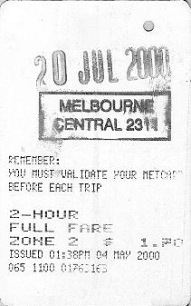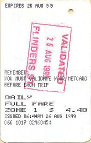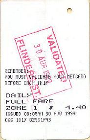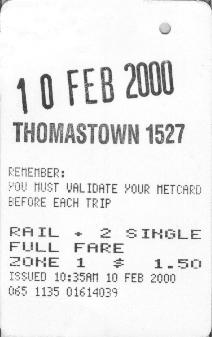 The "VALIDATED SPENCER ST" example is different again, and owes its existance to the Colonial Stadium complex. There is a large footbridge which extends from Bourke Street to the stadium which passes the northern ends of the Spencer Street suburban platforms (and country platforms 3&4). Each of these has a flight of stairs and two escalators between the platform and the footbridge. At first, only a temporary "ATCO" booking office was provided (located on the Colonial Stadium side of the platform 13/14 exit). This has recently been replaced by a more permanent structure. A passenger arriving without a ticket would be directed by a Customer Service Employee to purchase one from this booking office. Importantly, as there are currently no automatic fare gates or validators on the footbridge, all tickets issued from here would be hand validated at the time of issue. Again, only pre-encoded tickets are stocked. |