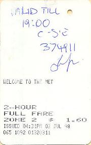 The above ticket is hand validated for essentially the same reason as the first two. At the city end of Richmond station there is an exit subway that is opened only for sporting and special events. The northern end serves the MCG and the southern basically serves the Tennis Centre and Multi-Purpose Venue. Interestingly, the southern exit has a standard validator only, and no fare gates; whilst the northern (Brunton Avenue) exits are guarded by a large bank of electronic barriers. The booking office here is manned firstly to deal with passengers who have arrived without a valid ticket and accounts for the "VALIDATED RICHMOND" hand stamp, and later in the evening to deal with ticket sales for crowds going home. In theory, this example should have been electronically validated to re-enter the system. As both these booking offices are manned only as required, they were not fitted with a BOM, but supplied with pre-encoded tickets.
